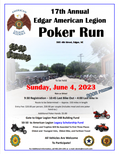 Come join us for the 17th annual Edgar ALR Poker Run. Rain or Shine! Registration begins at 9:30am – 10:45am Last Bike Out – 4:00pm Last Bike In. Route details to be determined, but we usually stop a Legions and bars. Entry Fee: $20.00 per person, $30 per couple (Includes meal and one dice hand) Additional Hand: $5.00 Gate goes to Edgar American Legion, 50-50 proceeds to the American Legion Legacy Scholarship Fund. Door prizes during evening meal, and medals and cash prizes for the top 3 dice totals. Any and All Vehicles Are Welcome To Participate!