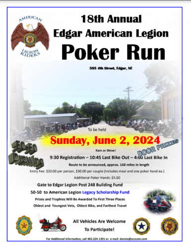 Come join us for the 18th annual Edgar ALR Poker Run. Rain or Shine! Registration begins at 9:30am – 10:45am Last Bike Out – 4:00pm Last Bike In. Route details to be determined, but we usually stop a Legions and bars. Entry Fee: $20.00 per person, $30 per couple (Includes meal and one dice hand) Additional Hand: $5.00 Gate goes to Edgar American Legion, 50-50 proceeds to the American Legion Legacy Scholarship Fund. Door prizes during evening meal, and medals and cash prizes for the top 3 dice totals. Any and All Vehicles Are Welcome To Participate!